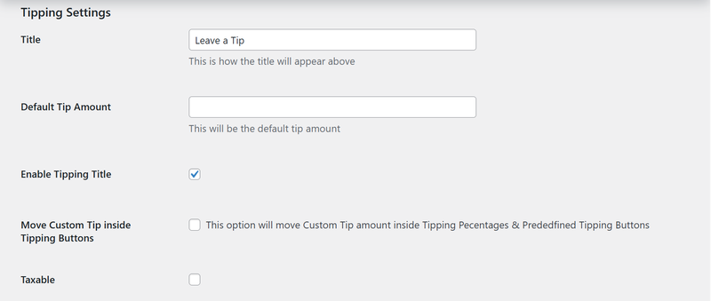 - Set the Title — Add a title like “Leave a Tip” to display at checkout. Check the Enable Tipping Title box if you want it visible.