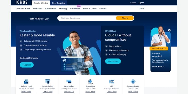 Their WordPress hosting package incorporates automated upgrades, advanced security features, and an intuitive control panel, streamlining website administration for enterprises. IONOS prioritizes speed by utilizing SSD storage, which improves website performance and ensures fast loading times. This is crucial for enhancing user experience and search engine rankings.