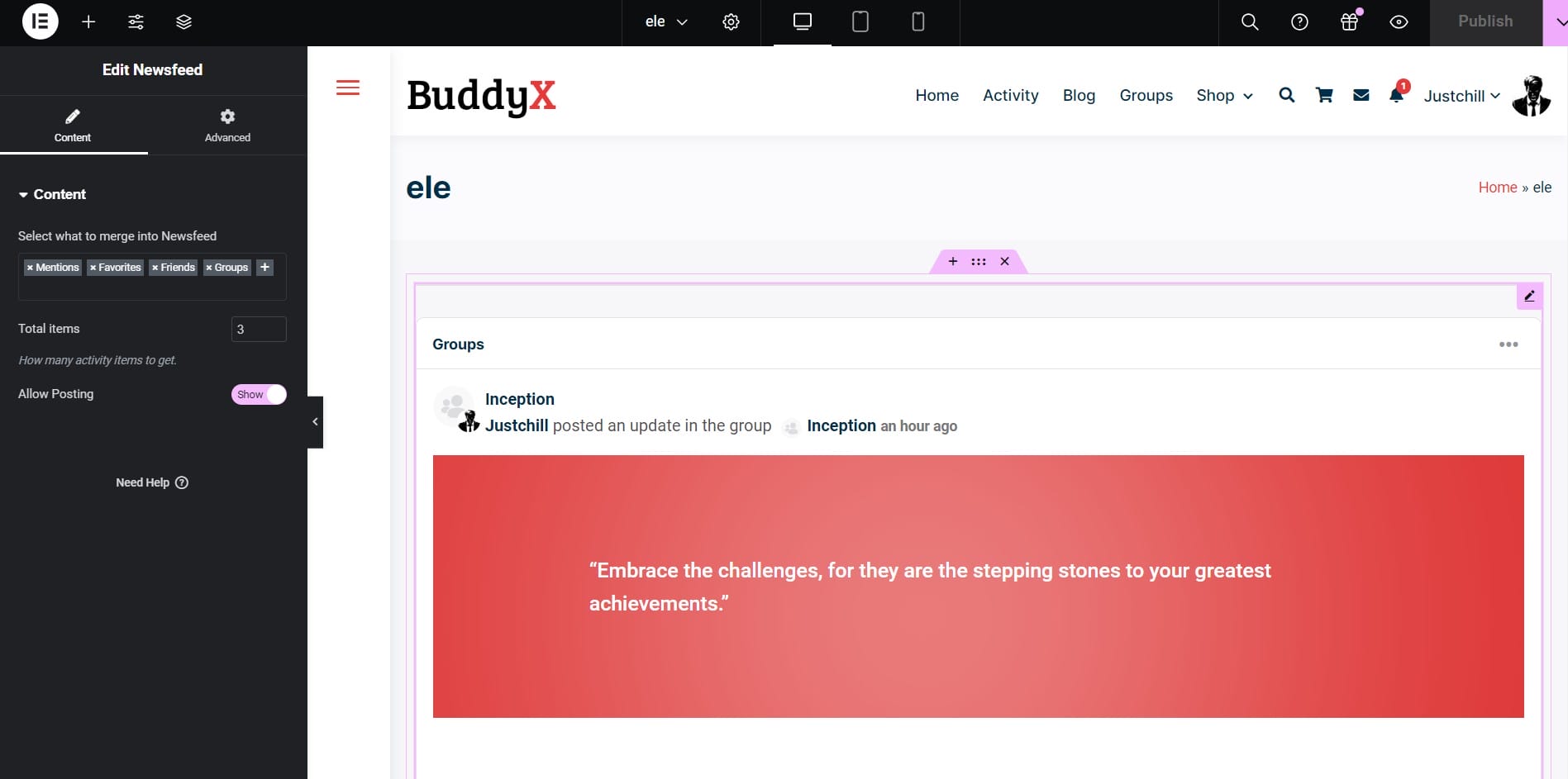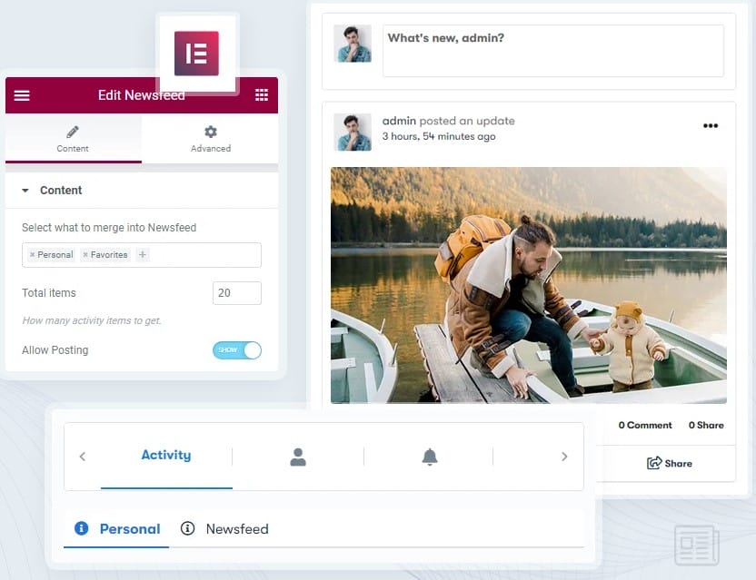 4. Newsfeed Elementor Widget: The plugin also includes a newsfeed Elementor widget, allowing admins to display any Elementor page using the newsfeed widget. This widget consolidates all activities— personal, group, friends, mentions, and favorites into one place, keeping your page free from unnecessary clutter.