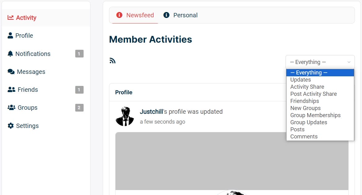 2. Segregated Activity Types: The plugin allows for the segregation of activities based on their types. Users can create dedicated tabs for different categories of activities, such as personal updates, group posts, and event announcements. This organization makes their newsfeed more structured and easy to navigate, helping them to quickly find the content they are interested in.