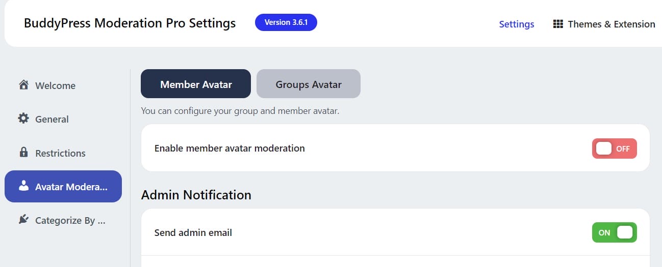 6. Member and Group Avatar Moderation: This feature enables you to moderate the avatars of both members and groups, ensuring that profile images do not cause any disruptions within the community. Additionally, it allows administrators to send custom email notifications upon approval or rejection of avatars.