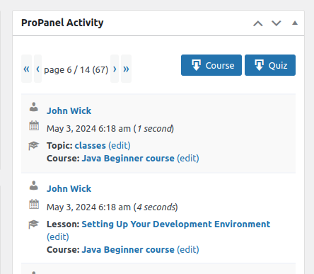 You can stay updated on live course activities with ProPanel Activity. It allows you to monitor learner engagement and progress in real-time. Additionally, you have the option to download the .csv file for both the course and quiz directly from this platform.