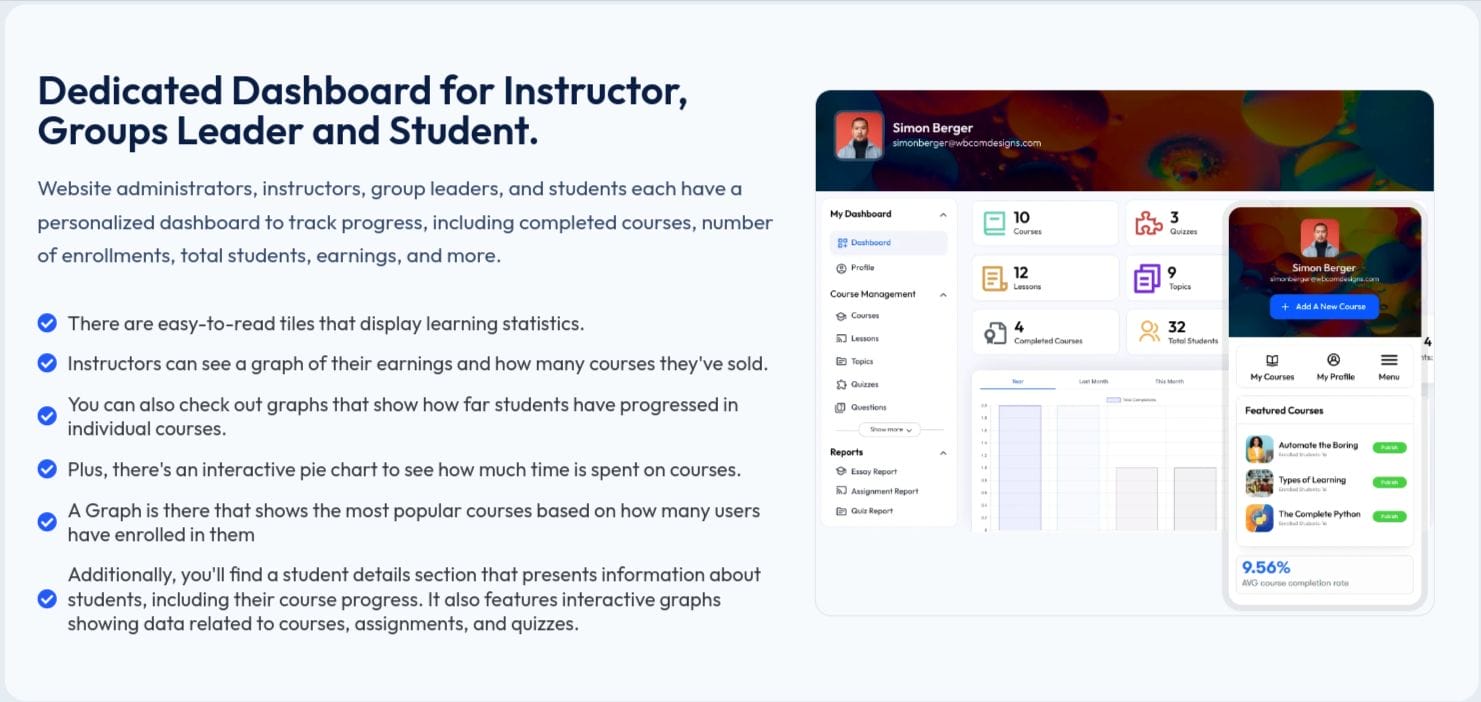 By using its advanced features, users can effortlessly manage courses, lessons, and reports directly from their dedicated dashboards. Moreover, it provides comprehensive tracking of course activities to monitor progress effectively.