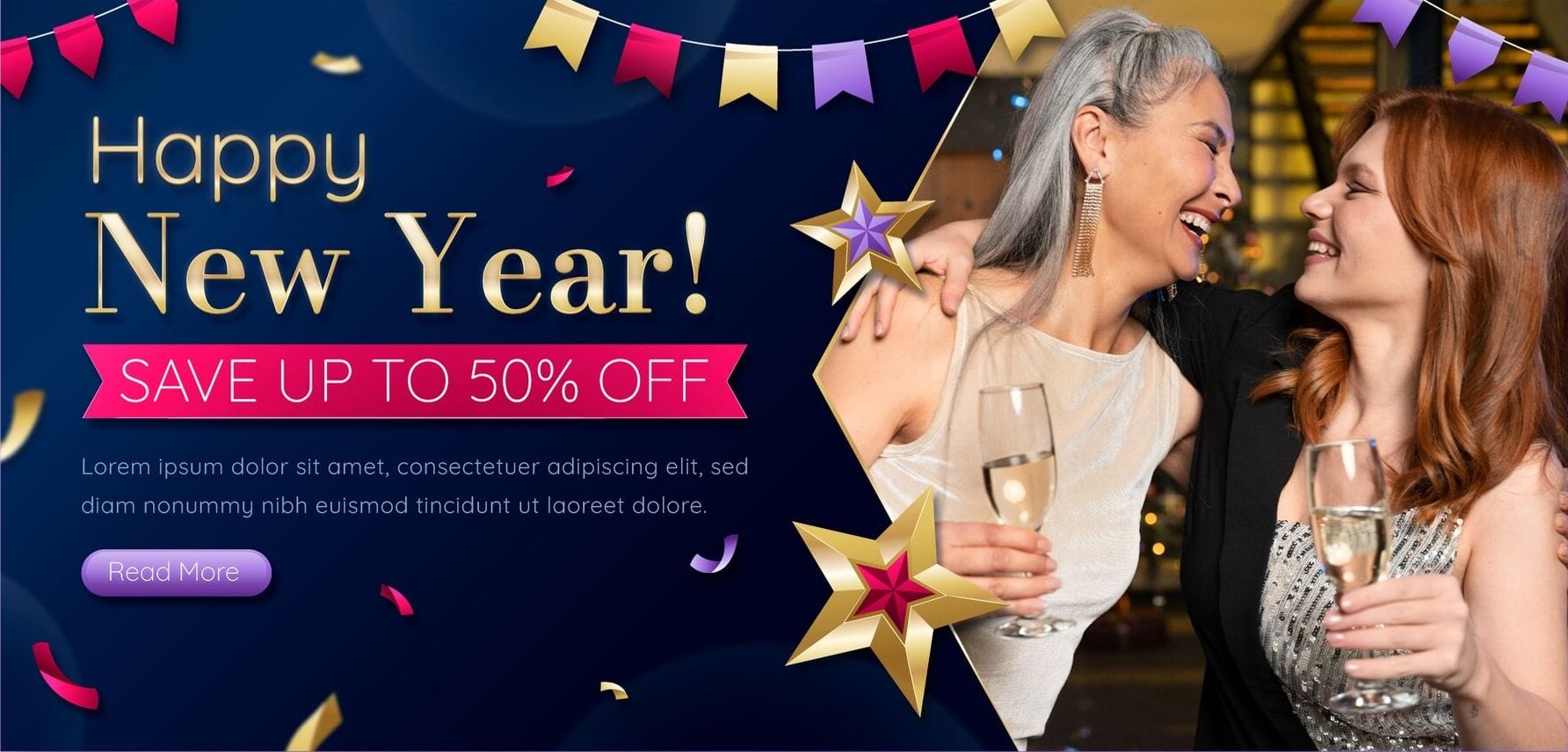 | New Year-Themed Banners for Your Website | Highlighting special offers on your site | Festive banners for homepage or landing pages | Free |
