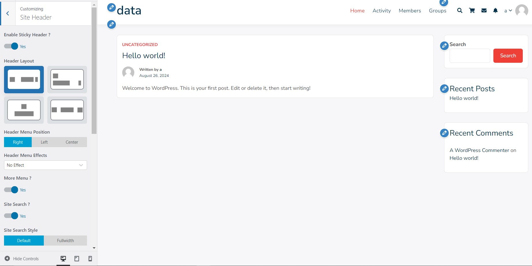 - Site Title & Tagline: Customize or hide the site title and tagline.