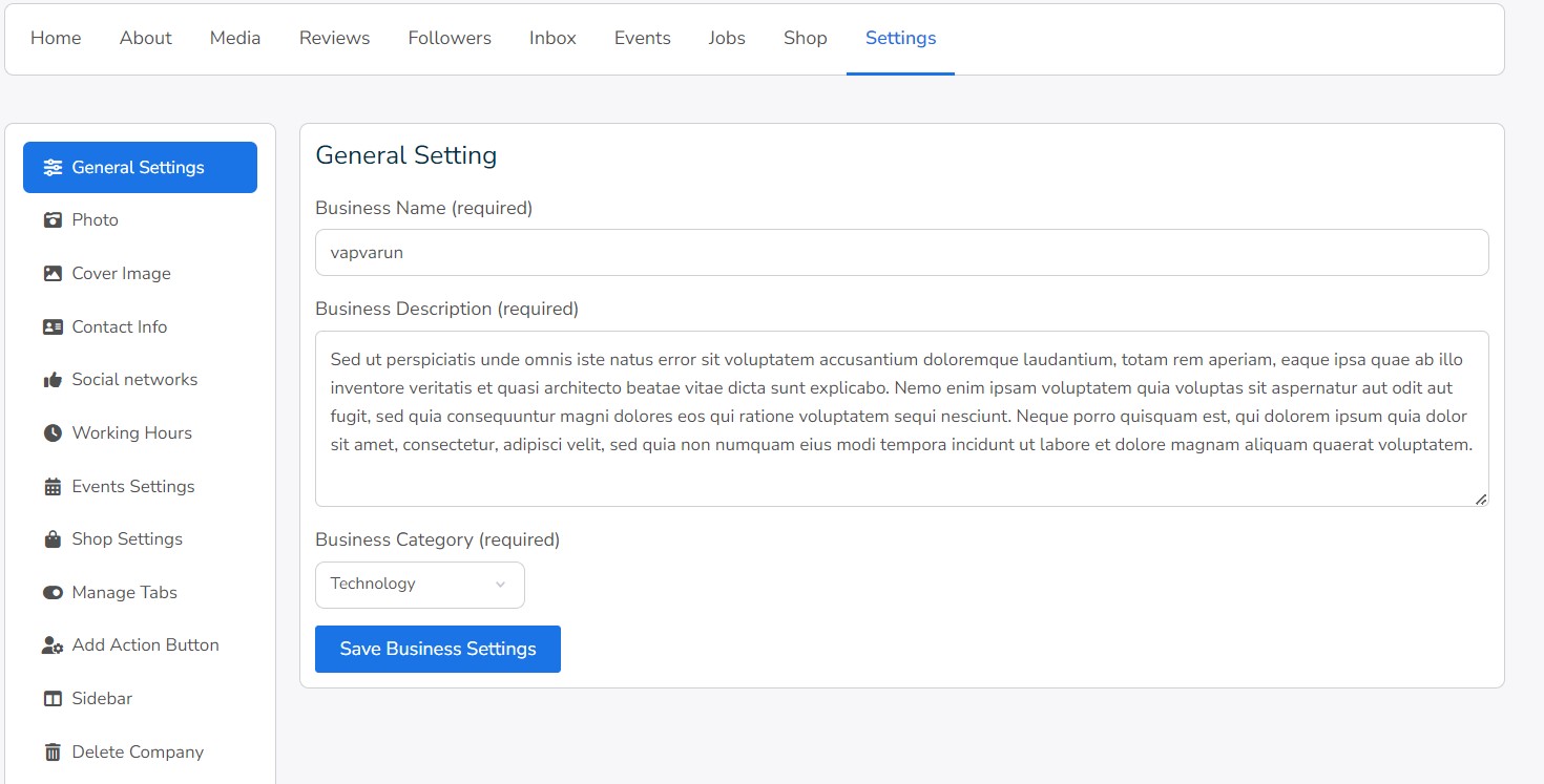 4. Settings: Page owners can manage the settings very easily by going to the settings tab of their businesses. It contains all the information you may need to make your page engaging and Popular. To learn more about the settings click here.