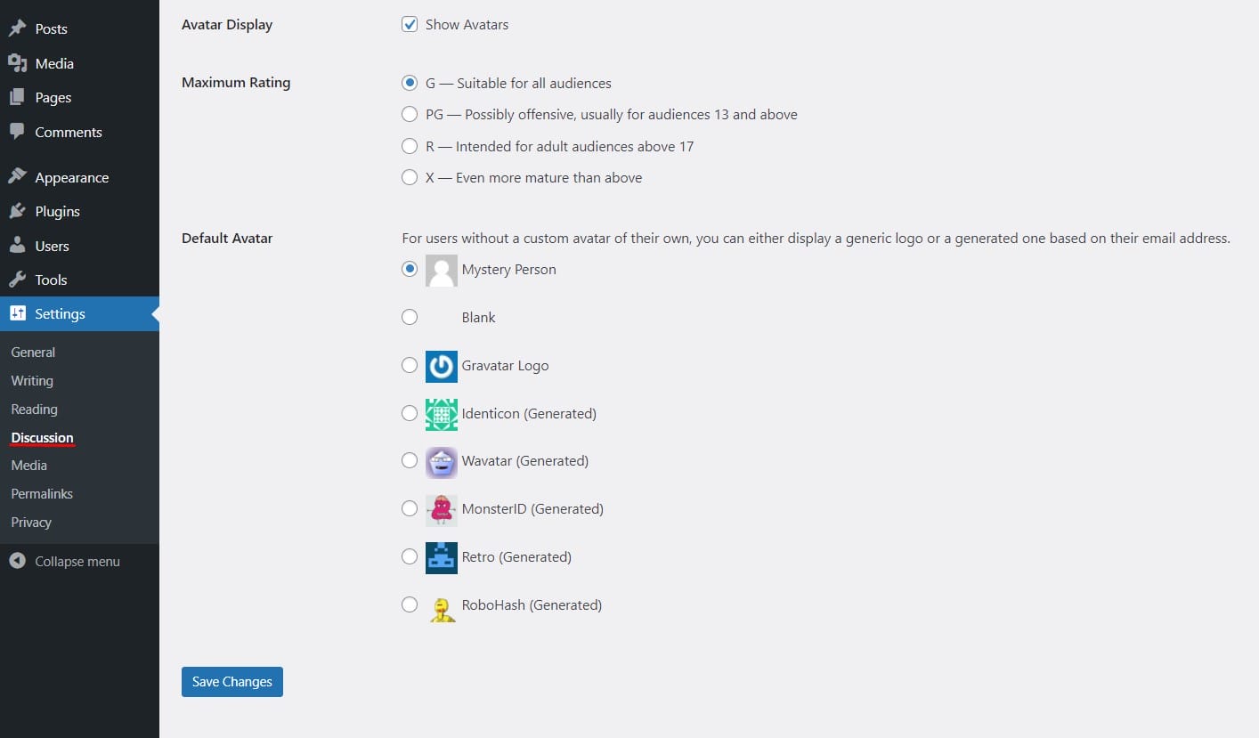 • Choose the appropriate rating for your avatar (G, PG, R, etc.), and make sure the Gravatar Logo is selected under Default Avatar.