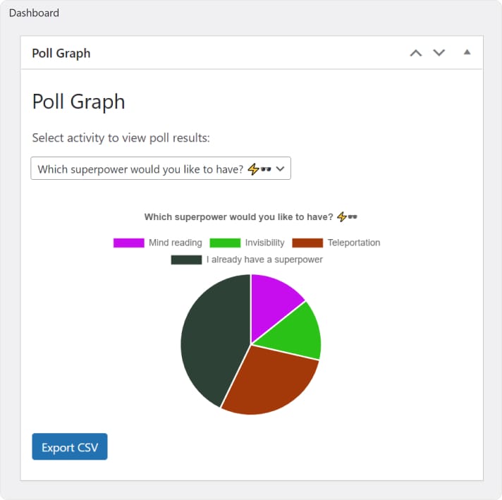 ii) Site Poll Data: The BuddyPress Polls widget allows the site admin to view data from all polls created sitewide, accessible directly from the WordPress Dashboard.