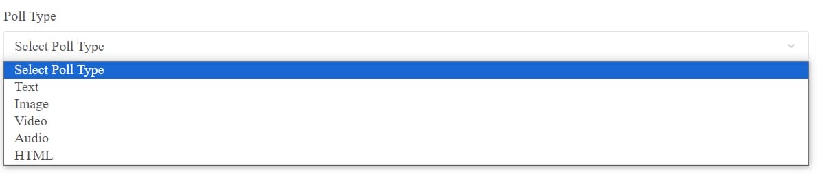 8. Set different poll types: BuddyPress Polls offers a variety of poll types to cater to different engagement strategies and user preferences. When creating a poll, you can select from text, image, video, audio and HTML.