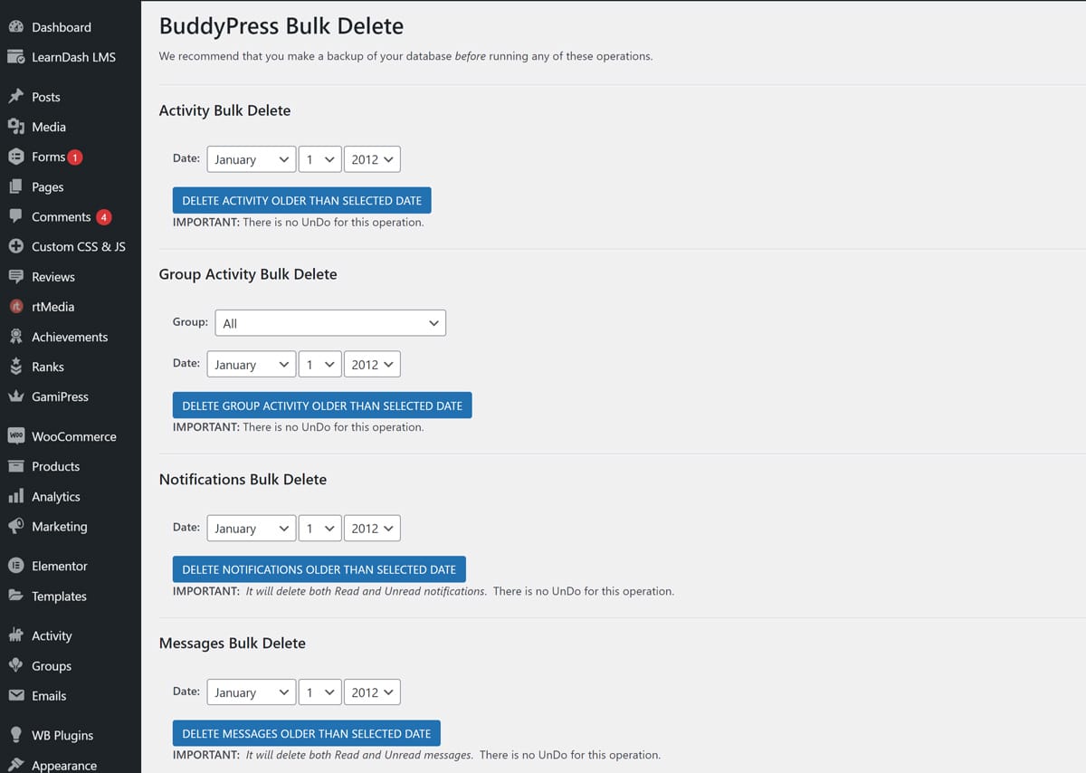- Bulk delete BuddyPress activity, messages, and notifications.