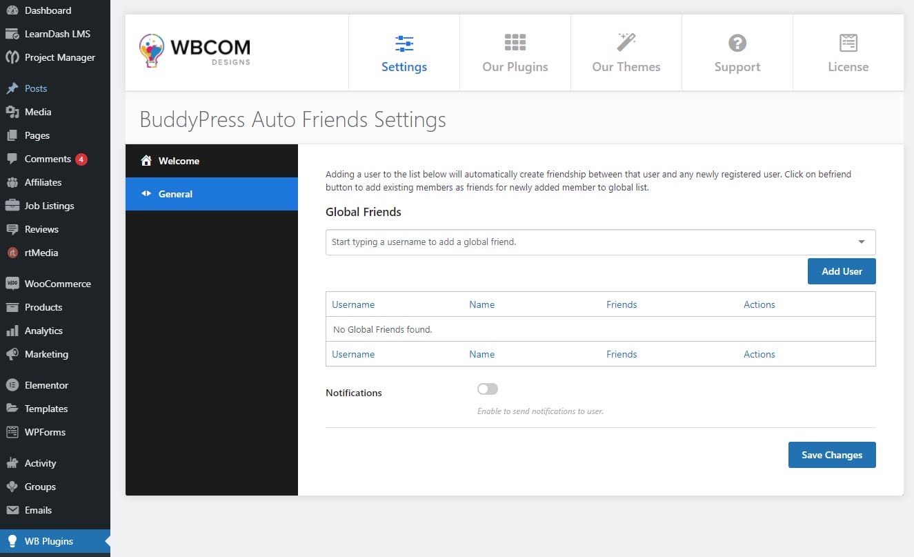 - Global Friends Management: Admins can add multiple members as global friends, who will be automatically connected with every new and existing user in the BuddyPress community.