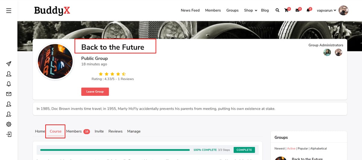 When a course is tied to a group, course actions are optionally added to the group’s activity stream. Group admins can determine which actions to allow in their group, including: