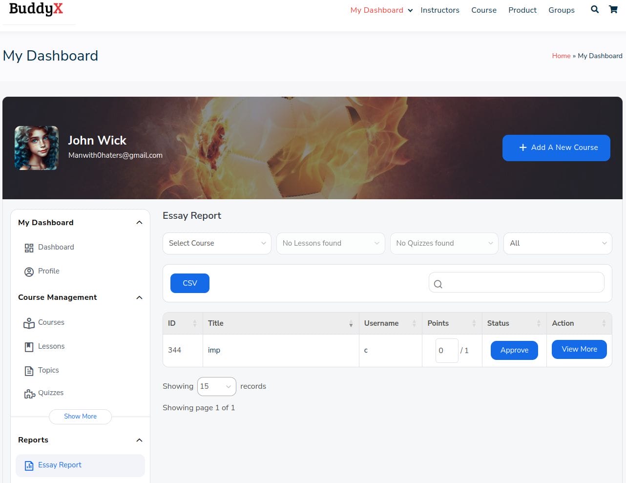 Instructors have the option to view the list of submitted essays under the report section, and can also approve them by awarding a point.