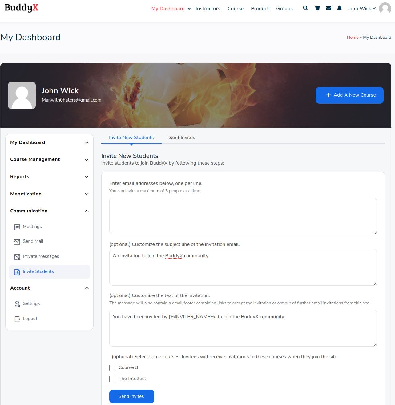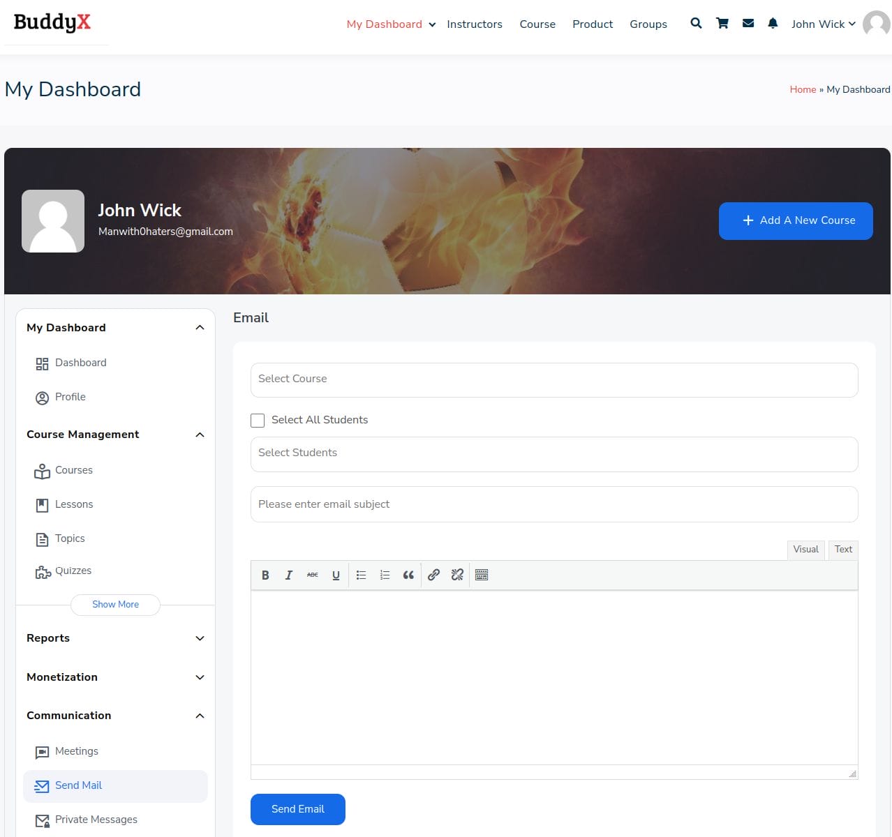 It is used to send direct message using Buddypress, you can select one or multiple students. This feature enables instructors to send messages to students via messages. By selecting a specific course, instructors can easily identify and communicate with enrolled students. The option to choose individual recipients or send to all provides flexibility. Crafting a clear subject line ensures recipients understand the purpose of the message, while the message box allows for detailed communication.