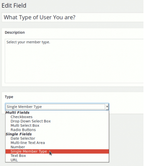 After activating the plugin, navigate to dashboard > users > profile fields and add a new profile field. You can select the field type ” single member type”.