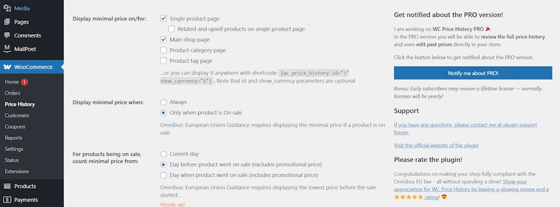 - In the WordPress dashboard, go to WooCommerce → Price History.