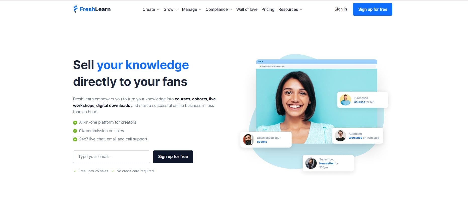 FreshLearn is a platform that lets you sell digital items and online classes on your own branded website without requiring you to know how to code.