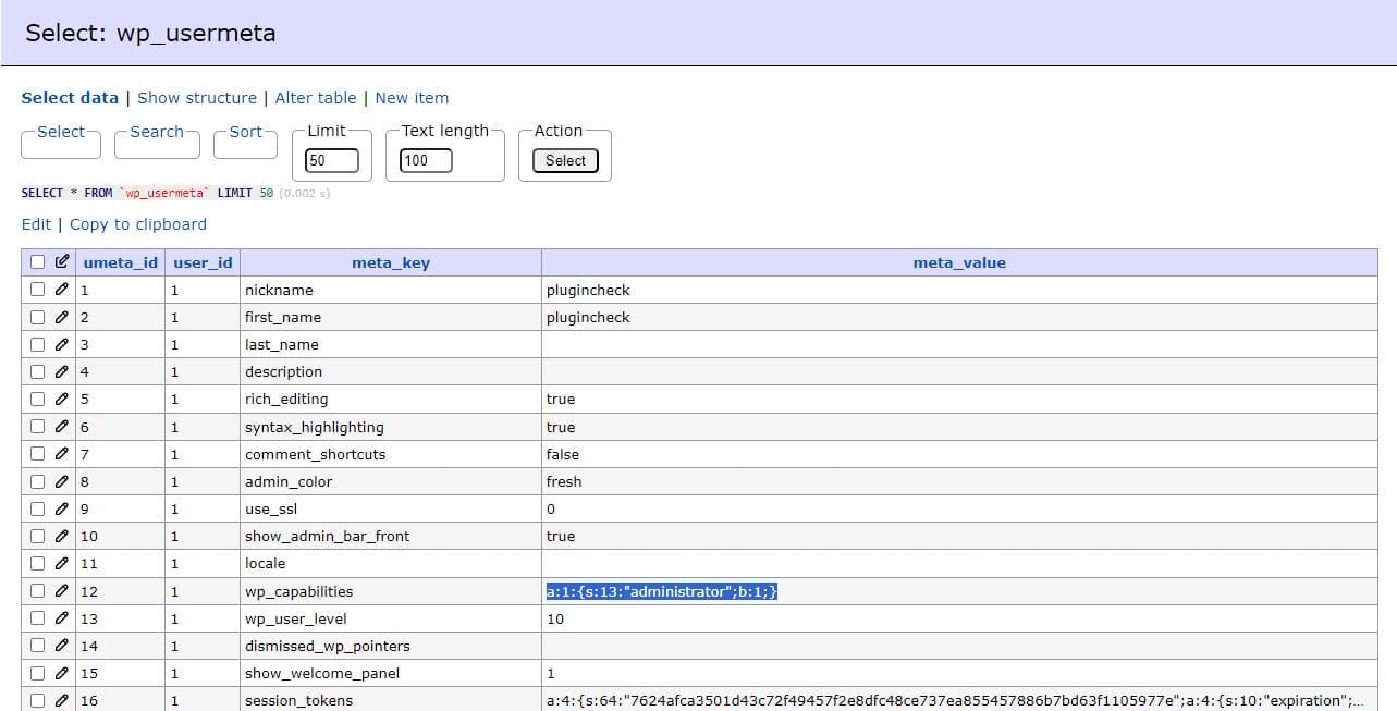 This table stores additional metadata for each user, including the admin. This metadata includes user roles, capabilities, and any other custom information stored about the user. Some of the key fields include: